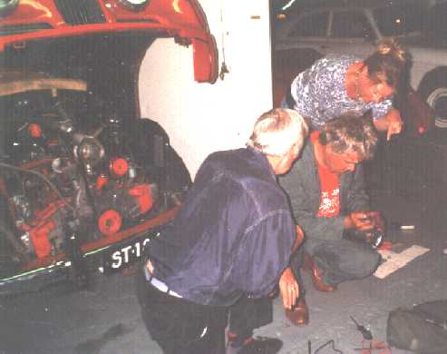 At Caen, where the group spent two nights, there was time for maintenance in the car park beneath our hotels. Here the distributor of the van der Vaart Jupiter is removed for essential work. |